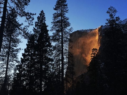 Every year, rain and snow runoff slip down the eastern face of El Capitan, creating a narrow waterfall that drops over two thousand feet to the valley. In February, for about a two week period, the setting sun lights the waterfall aglow with orange hues for about eight minutes, creating one of the most breathtaking, and sought-after, national park experiences that’s over in the blink of an eye. The resulting “firefall” attracts thousands of visitors into the park every year, creating long lines and parking congestion throughout the park.